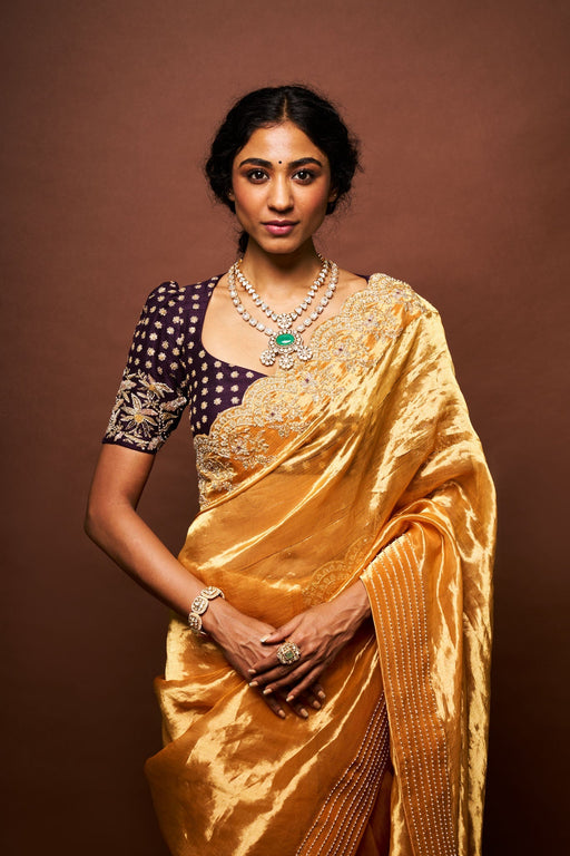 View full detailsDescription: Crafted in opulent tissue fabric , the saree Features a captivating scallop border. The intricate pearl and cut dana embroidery border...