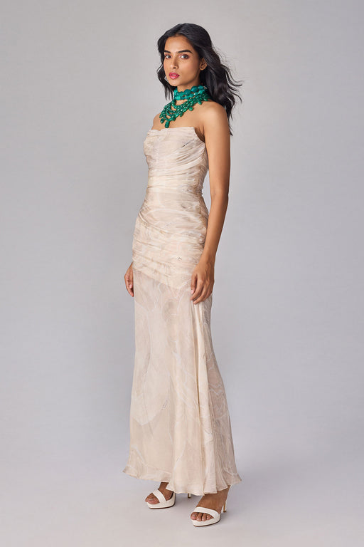 Floral print, corset style strapless gown with hand pleated bodice