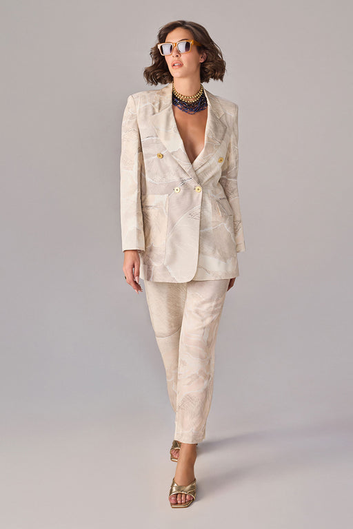 Blazer : Abstract floral print, long line blazer with hand embroidered tassle outline and patch pocket detailing Skirt : Abstract floral placement...