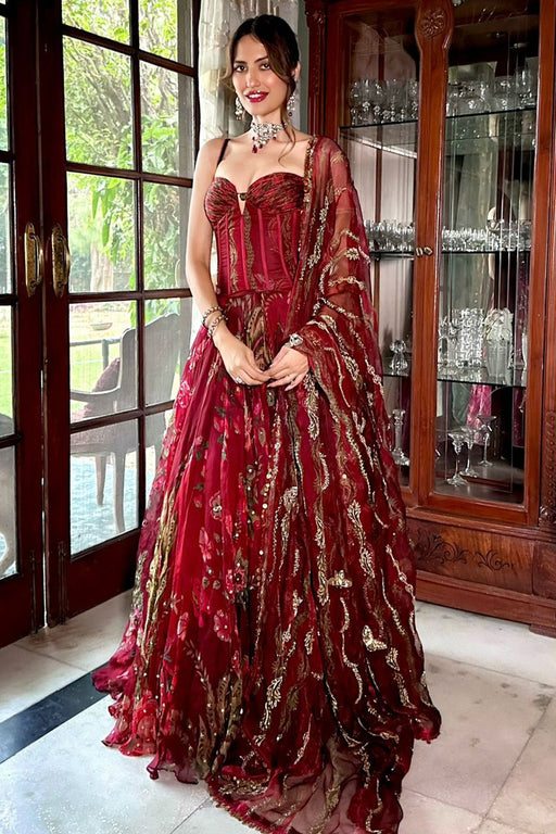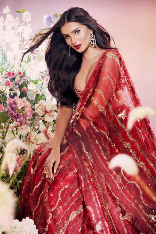 View full detailsPleated Signature Mm Corset Paired with An Embellished Lehenga and Duppata FABRIC: Organza COLOR: Sindoori Red NO. OF COMPONENTS: 3 DELIVERY TIME:...