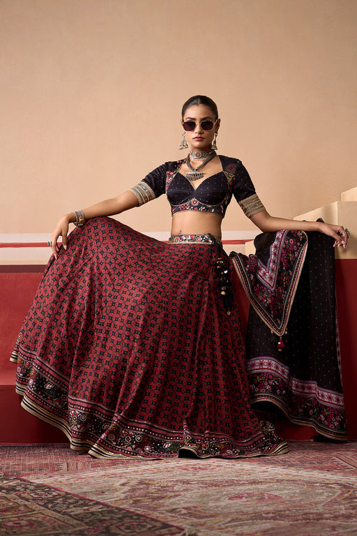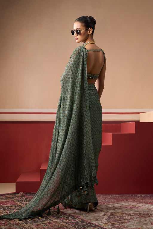 Metallic sequins, Zari, gota, pearls, buttons, tassels and coins.