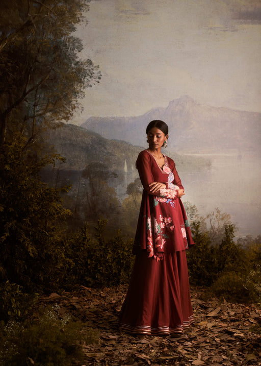 Featuring an exquisite wildberry print crepe anarkali set paired with shimmer chiffon dupatta, an embodiment of exquisite refinement. This ensemble...
