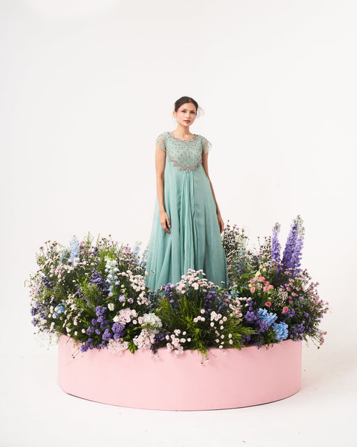 The Tara boutique turquoise Embroidered Long Dress is a sophisticated and alluring ensemble. With its boutique turquoise color and intricate embroi...