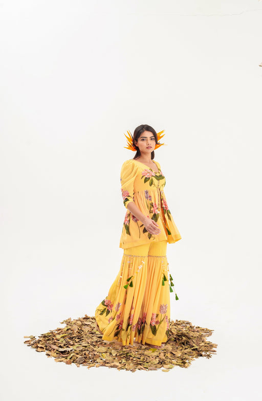 A champagne yellow floral sharara set is a charming and vibrant traditional outfit that consists of a matching top, flared pants (sharara), and a d...