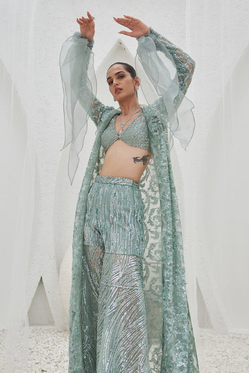 View full detailsFeaturing a lime green printed sharara. It is paired with matching hand embroidered inner with pearl work and cape
