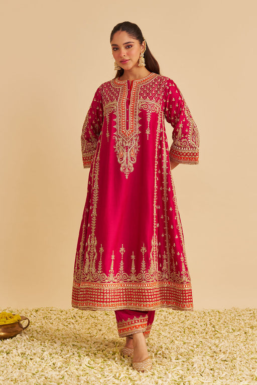 View full detailsThis regal long A-line ensemble is crafted in luxurious pure silk chanderi, paired with flowing palazzos and a delicate silk organza dupatta. The s...