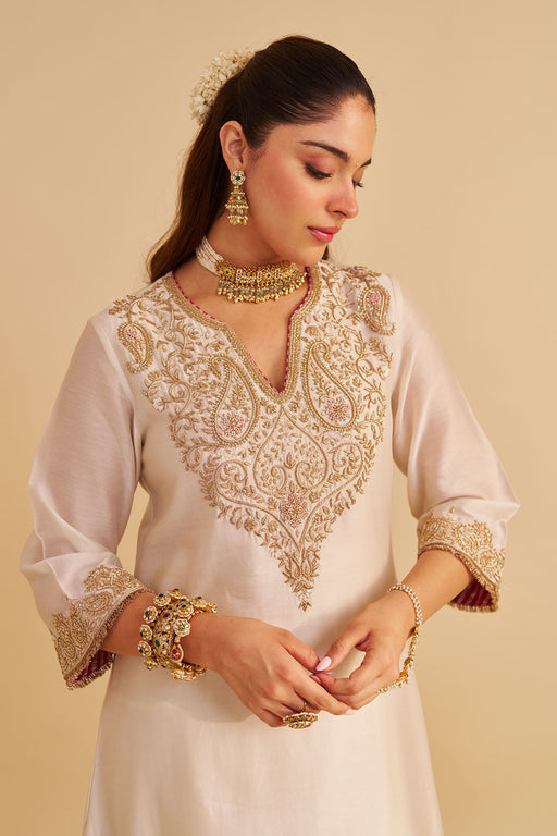 View full detailsAn elegant ensemble featuring a pure Banarasi short kurta with a zero neckline and front slit, zero back, and elbow sleeves. It is paired with a sh...