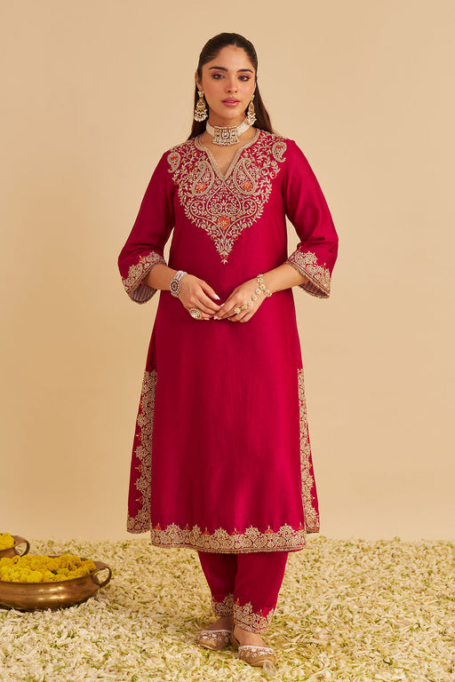 View full detailsThis long A-line kurta is a perfect blend of traditional craftsmanship and contemporary style. Crafted with a sleek zero neckline featuring a subtl...