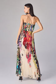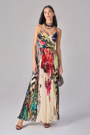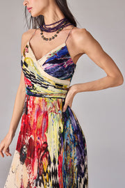 Floral and abstract print, hand micro pleat maxi dress with surplice bodice and noodle straps