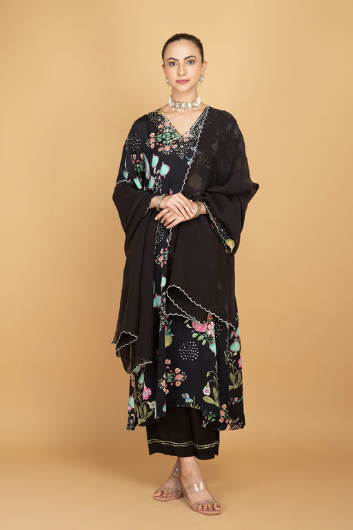 View full detailsFeaturing a black floral printed kurta adorned with intricate sequin work. . It is paired with solid black crepe pants for a sleek silhouette and a...