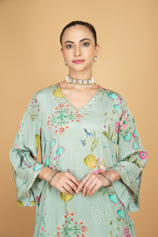 Featuring a green floral printed kurta adorned with intricate sequin work. . It is paired with solid black crepe pants for a sleek silhouette and a...