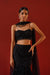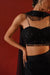 Kapda Dori's stunning black lace fabric lehenga set. The skirt features a full-length stuctured flared look . The black color adds a touch of glamour and sophistication to your look, while the fabric texture ensures you feel comfortable all day or night long. It is styled with a black net blouse fully embroidered with crystals, cutdana and sequins. Pair it with complimenting soft net chokar embroidered dupatta.