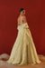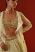 Kapda Dori's stunning mint green gathered organza lehenga, beautifully adorned with intricate mirror, zari and stones work on belt. The mint green color adds a touch of glamour and sophistication to your look, while the soft fabric ensures you feel comfortable all day or night long. It is styled with a mint green dupion silk blouse hand embroidered with mirror, zari and stones. Pair it with complimenting mint green organza embroidered long ruffle jacket.