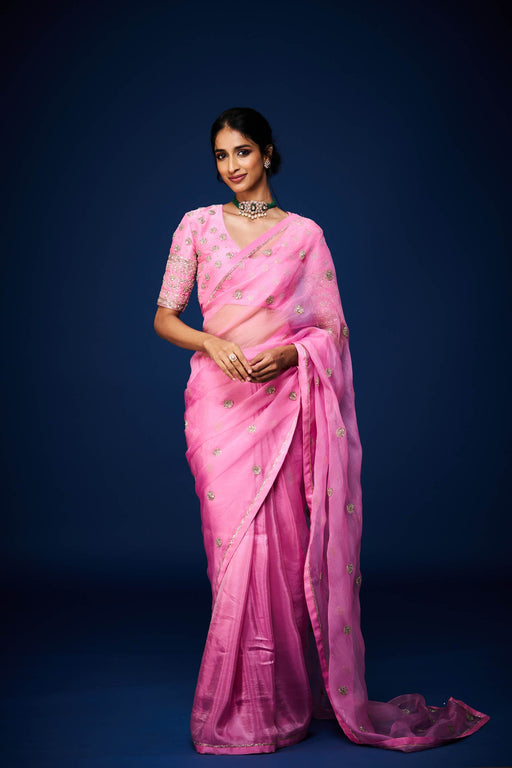 Description - Taffy Pink Hand Embroidery border Organza saree only Saree details:Border : Hand embroidered borderFabric : OrganzaColour : Taffy...
