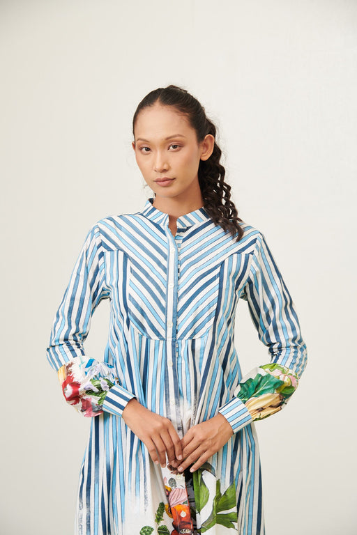 View full detailsThe Blue Stripes and Floral Print Dress is a delightful combination of classic stripes and charming floral motifs. The blend of stripes and florals...