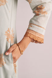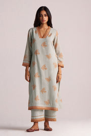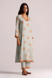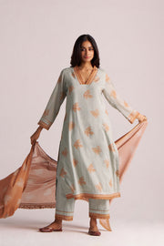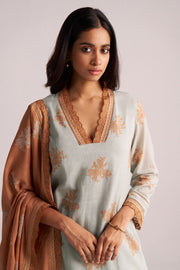 This set includes print kurta, dupatta and solid bottom. kurta has embroidered neckline and sleeves, bottom and dupatta also has embroidery and laces attachment.