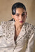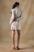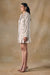 Gold foil single breasted mini blazerdress with notched collar, intricate 3D floral embroidery along the neckline and pleated hemline with snap button for multiurpose styling.