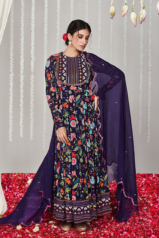 View full detailsPurple floral printed Anarkali in georgette fabric with embroidered neckline and silk organza dupatta with sequin embroidery a...