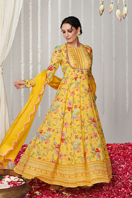 View full detailsYellow floral printed Anarkali in georgette fabric with embroidered neckline and silk organza dupatta with sequin embroidery a...