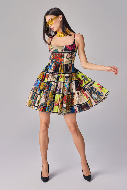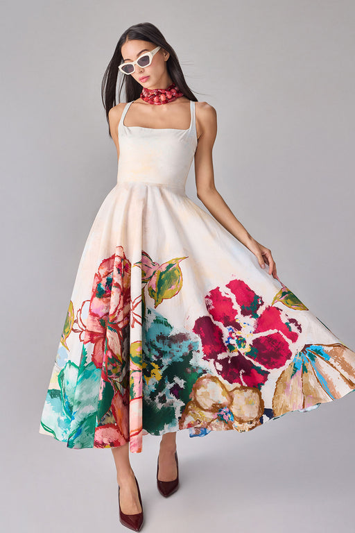 Square neck midi dress with abstract floral print placement and fitted bodice