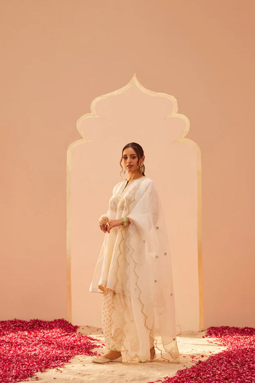 View full detailsWhite floral printed Anarkali in georgette fabric with embroidered neckline and silk organza dupatta with sequin embroidery an...