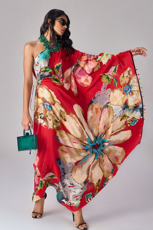 Floral print assymetric, one shoulder kaftan with side tie and hand embroidered tassle tie ups