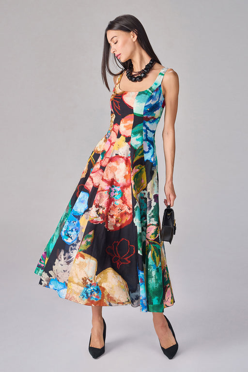 Tribal Print Midi Flared Dress With Fitted Bodice And Square Neck Gond Emily Dress