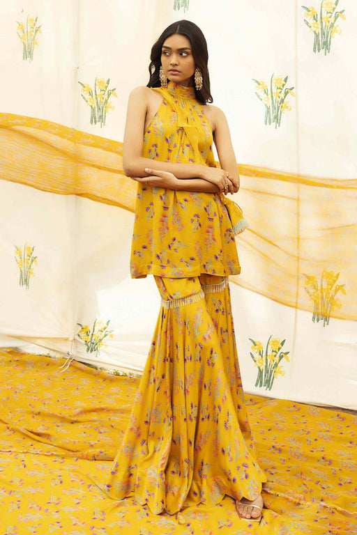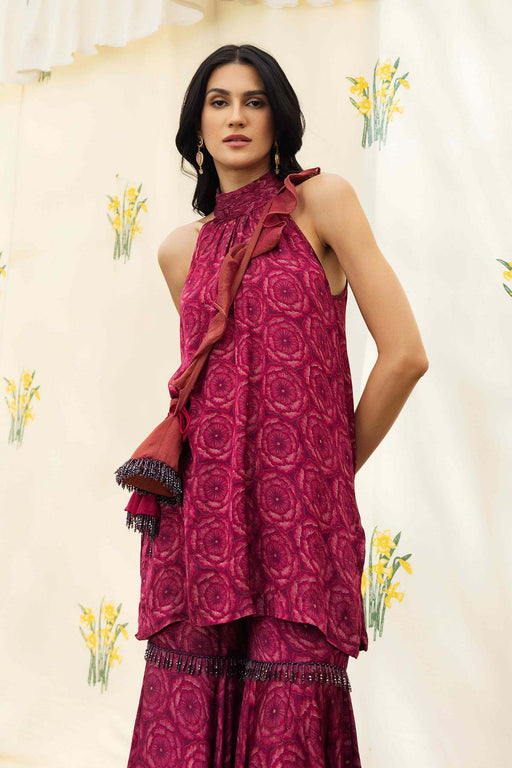 Our custom 'Amara' print takes form in this kurta set. It is adorned with shimmering metallic zari and sequins on the neck, sleeves and the borders...