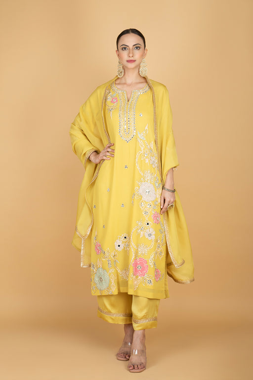 View full detailsFeaturing lime yellow embroidered georgette kurta, paired with a contrasting modal silk pants with detailed work on edges. Shaded contrasting dupa...