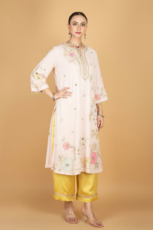 View full detailsPastel pink kurta featuring hand embroidered beads and sequins with a notched neckline. Paired with a straight pant and a dupatta with a hand embro...