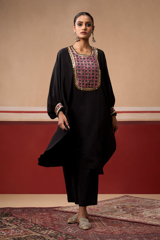 View full detailsBlack kurta featuring hand embroidered sequins and beads with a notched neckline. Paired with matching plain pant and dupatta with hand embroidered...