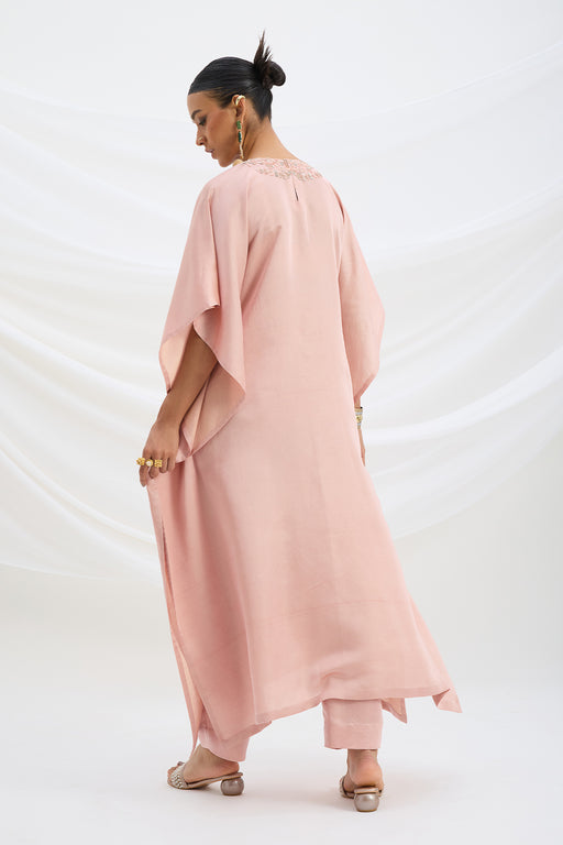 View full detailsEMBROIDERED PEACH PINK KAFTAN WITH BOTTOM • Color: PEACH PINK • No. of Components: 2 • Fabric: SEMI SATIN • Length: KAFTAN- 54" ...