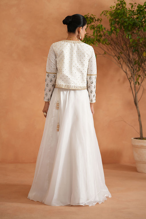 Cannoli Cream kali lehenga in pure silk and embellished with white and gold embroidery on bottom.
