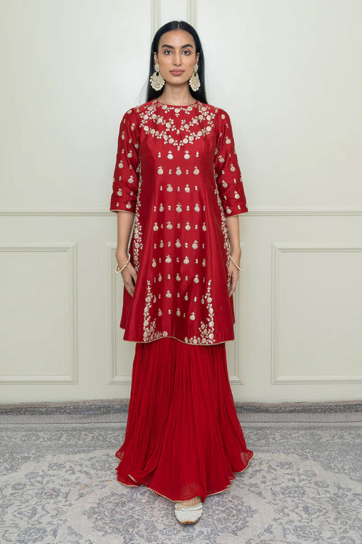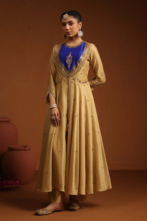 View full detailsThe Shahira emsemble is enhanced with our signature Kashmiri Tilla embroidery. It features a princess-cut A-line kurta with zero neck and three-qua...