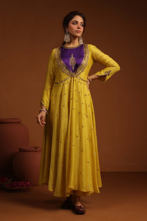 View full detailsKapda Dori's stunning lime green banarsi booti georgette anarkali detailed with fuchsia contrast gota pearl lace. The lime green color adds a touch...