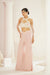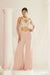Kapda Dori's stunning blush pink armani satin fabric flared pallazo, beautifully adorned with pearl detail on belt. The pallazo features a full-length flared look. The blush pink color adds a touch of glamour and sophistication to your look, while the fabric texture ensures you feel comfortable all day or night long. It is styled with a blush pink satin blouse adorned with hand embroidery with pearls, crystals, sequens and flared sleeves.