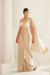 Kapda Dori's stunning nude ready to wear saree, beautifully adorned with intricate pearl details on pallu. The nude color adds a touch of glamour and sophistication to your look, while the soft geogratte ensures you feel comfortable all day or night long. It is styled with a ivory geogratte blouse fully embroidered with crystals,perals, stones and sequins adorned with beautiful perals on strape to complete the look.