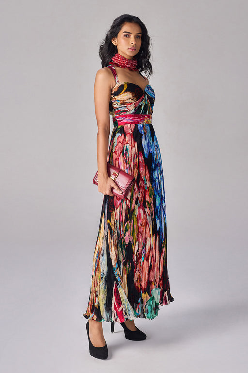 View full detailsFloral print, hand micro pleat maxi dress with sweetheart neckline and waist band detailing