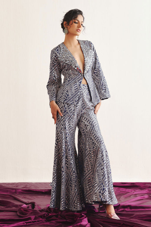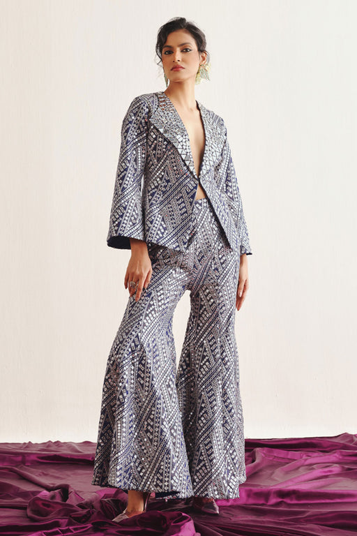 View full detailsFlared Shararas Color: Silver Fit: Comfortable Fit Fabric Details: This Mirrorwork and Beadwork Tulle Garment is specially designed by our team an...