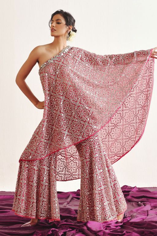 Hand-Embroidered Sharara Set in Red – A stunning fusion of tradition and elegance, this georgette and viscose organza sharara set is adorned with i...