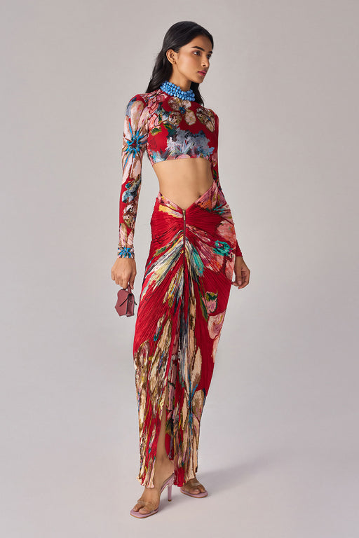 Blouse : Floral print tshirt style long sleeve, boat neck blouse Skirt : Floral print, hand micro pleated asymmetric maxi skirt with zipper detailing
