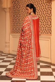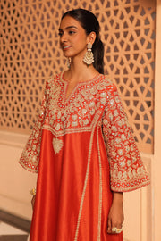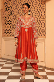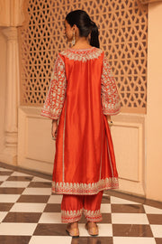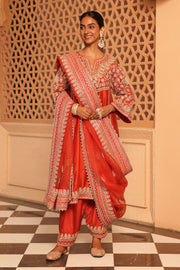 This ensemble is made in pure silk chanderi fabric and adorned with heritage Kashmiri Tilla Embroidery with Mirror. It features a zero neck with slit and three-quarter bell sleeves. The Chauga is fully embroidered with panels and paired with an embroidered salwar.