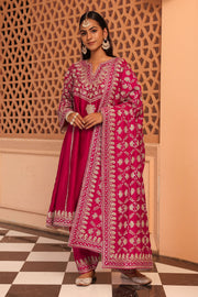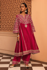 The Aiman ensemble is crafted in pure Silk Chanderi fabric and is adorned with our signature Kashmiri Tilla Embroidery along with Heritage Mirror work. It features a zero neck with a slit and three-quarter bell sleeves. The Chauga is fully embroidered with panels and paired with an embroidered salwar.