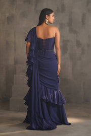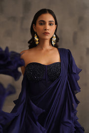 Deepika Chadha's stunning Navy blue Organza corset beautifully adorned with intricate sequins, cutdana, stones and crystal embroidery . The georgette and organza ruffle stitched saree is perfect for wedding and festive season.