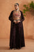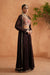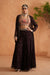 Deepika Chadha's stunning Brown printed chinnon fabric blouse, beautifully adorned with gold borders. The flowy brown georgette sharara, highlighted with embroidered bootis, adds a touch of tradition and sophistication to your look, while brown georgette long jacket highlighted with bootis and golden borders keeps you light and comfortable all day long and is perfect for wedding and festive season.