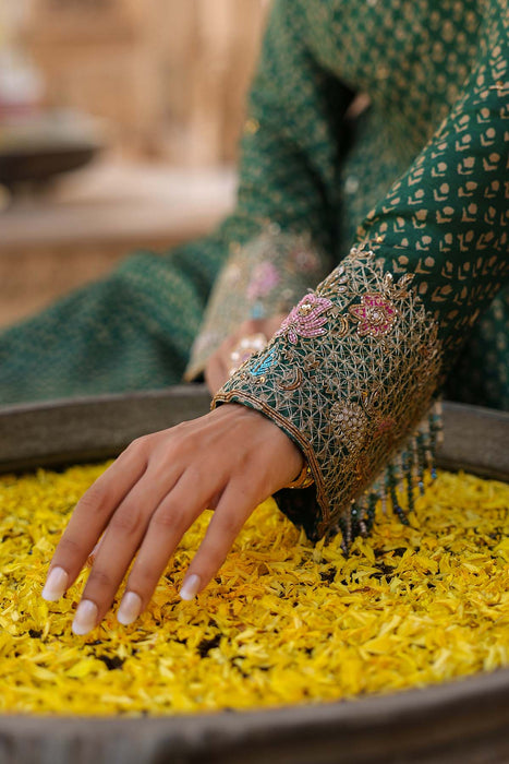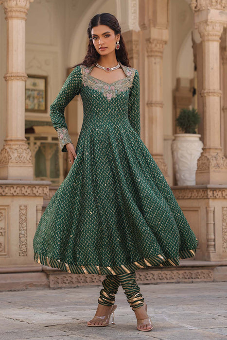 This 3 piece printed kalidar set comes with heavily hand embroidered zardosi, pearl and sequins work neckline, enhanced with zardosi butis spread all over kurta along with printed churidar with gota detaling. It is paired with organza leheriya dupatta enhanced with zardosi butis spread all over along with lace and latkans.
