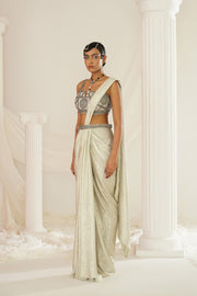 Silver grey embroidered blouse with ready to wear drape saree set