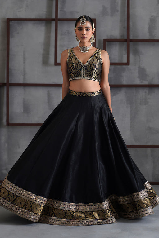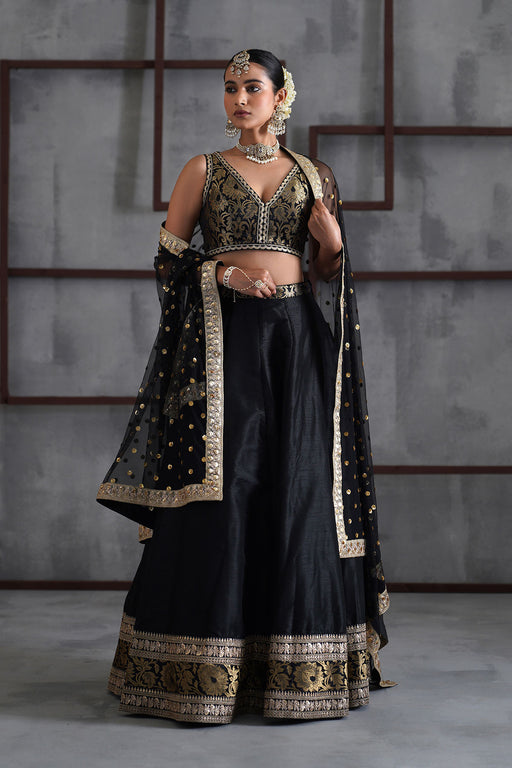 Deepika Chadha's stunning Black and gold brocade fabric blouse, beautifully adorned embroidered borders. The flowy black dupion silk lehanga with b...