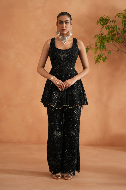 Deepika Chadha's stunning Black net thread work fabric peplum, it is paired with structured thread work flaired pants which makes you feel comforta...