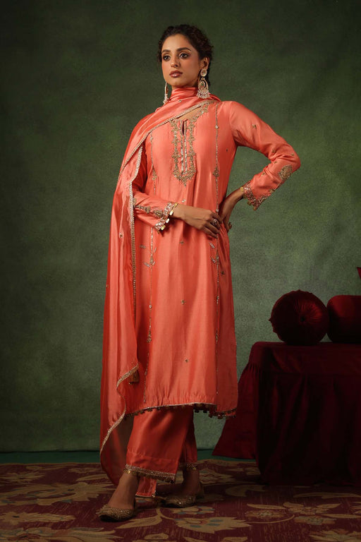 This 2 pc kurta set comes with zardosi embroidery on the neckline, sleeves and butis spread all over the kurta. The hem of the sleeves, kurta and p...